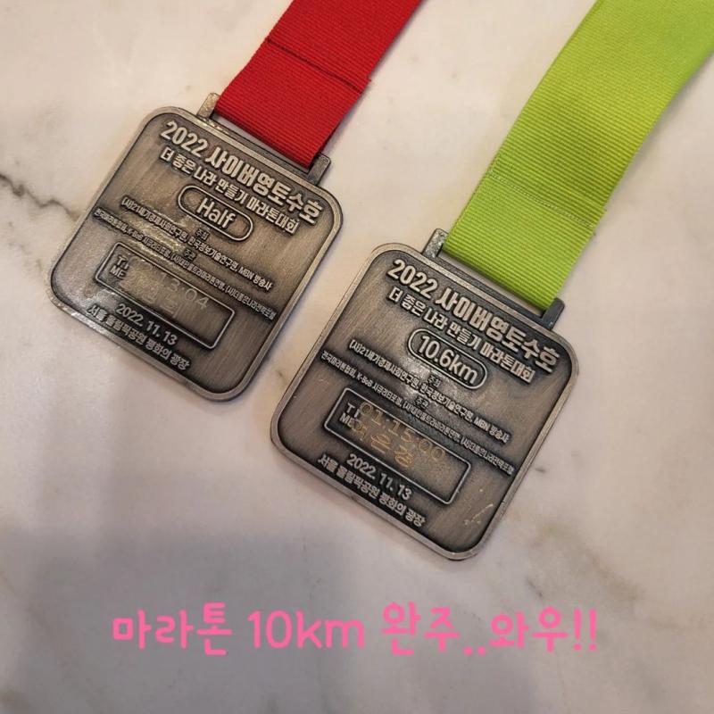 마라톤 10km 완주!! 오랜만에 뭔가 해낸것 같아 뿌듯하네요. 22km 하프마라톤 완주한 남편은 아직도 감동에 취한것 같습니다.ㅋㅋㅋ. 수천명의 사람들이 동시에 뛰어나가는 열정적인 모습에 에네지 받은듯합니다. 사이버영토수호마라톤 뿌듯뿌듯 인생은즐거워 분홍코끼리